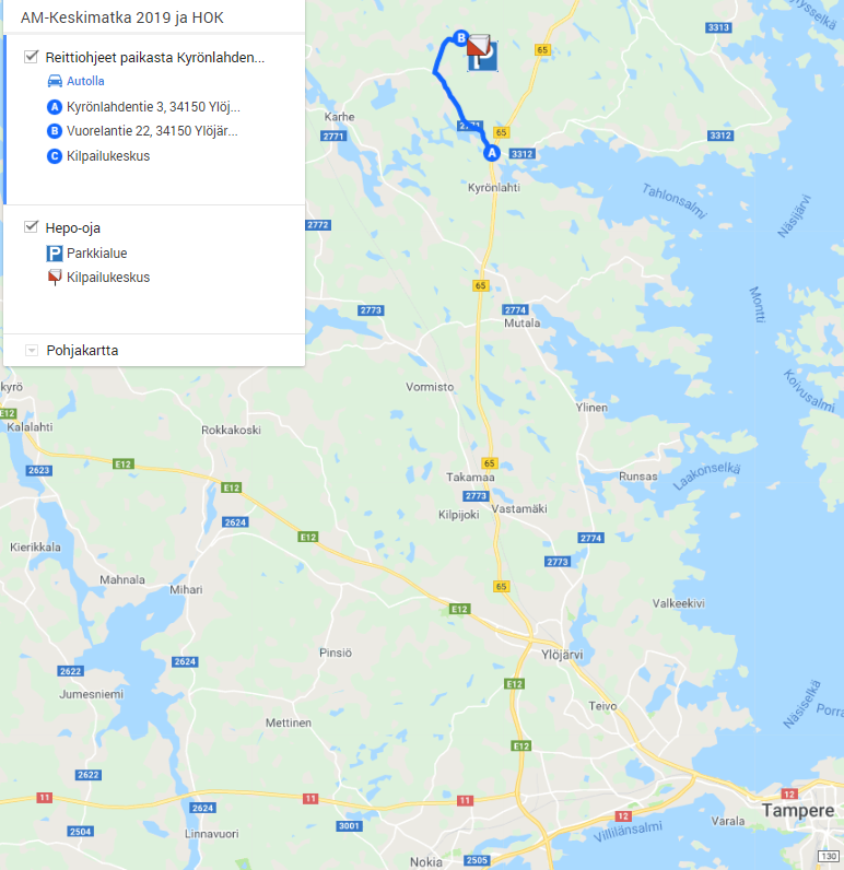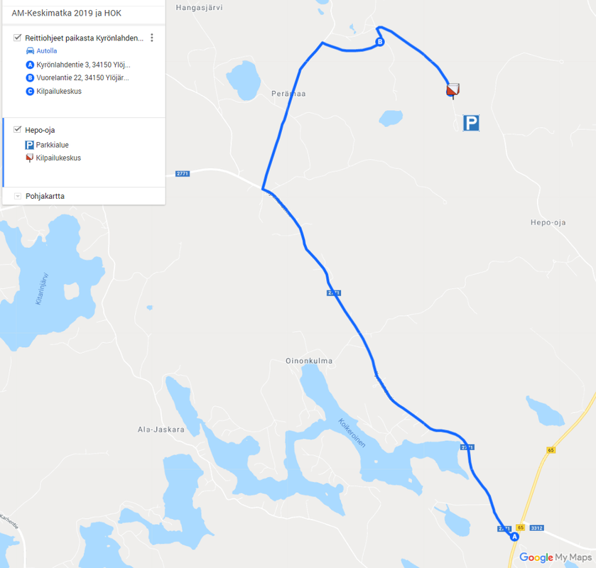 Kilpailukeskuksen opastus alkaa Valtatieltä 65 noin 18 km Ylöjärveltä Kurun suuntaan, tien 2771 risteyksestä alla olevien kuvien mukaisesti. Risteyksestä on noin 10 min ajomatka pysäköintiin, joka tapahtuu kilpailukeskuksen läheisyydessä. Pysäköinnistä etäisyys kilpailukeskukseen on enintään 500m. Opastuksen aloituspiste on 61.715910, 23.547568, Google maps -pluskoodi on PG8X+83.