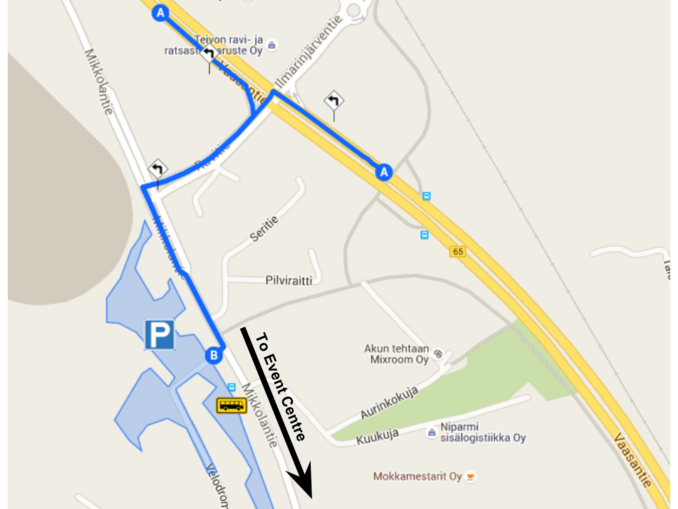 For safety reasons, it is not allowed to park cars near the event center. The car parking locates at Teivo Racetrack, which address is Ravitie, Ylöjärvi (61º 31' 45" / 23º 37' 49"). The driving instructions to the parking area will be posted from Vaasantie, road number 65, on 19th of September at 07:00 a.m. The location of the parking area is shown on the maps below (Figure 1 and Figure 2).