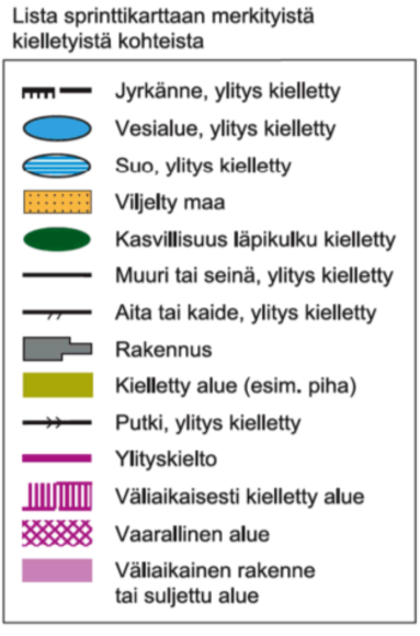 Lajisäännön 3.631 mukaisesti sprinttikilpailussa sprinttikarttaan kulkuesteenä tai kiellettynä alueena kuvattua kohdetta ei saa käyttää kulkureittinä eikä tällaista kohdetta saa myöskään ylittää, alittaa, mennä läpi tai muullakaan tavoin käyttää. Esimerkiksi kaikki yli- tai alipääsemätöntä paikkaa tarkoittavat merkit ovat samalla kiellettyjä alueita tai reittejä. Järjestäjä valvoo kiellettyjä alueita, ja niitä rikkovat kilpailijat hylätään.