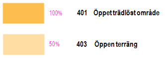 På tävlingskartan har använts symbol 401 och 403 för att markera öppet område. Symbol 401 markerar välskött gräsplan. Symbol 403 markerar områden med längre gräsväxt.